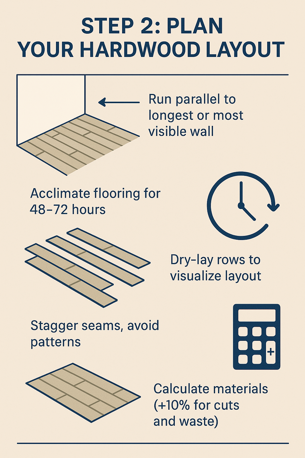 For most rooms, it’s best to run hardwood planks parallel to the longest or most visible wall—this creates a sense of flow and makes the space appear larger. If installing in multiple rooms, consider how planks will align through doorways and transitions.