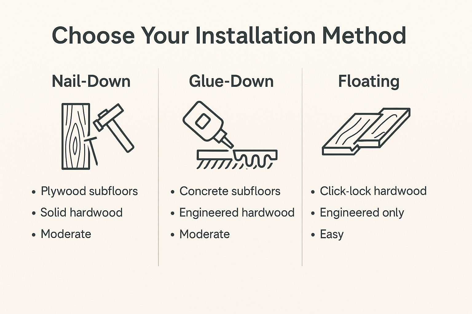 Before you begin laying any boards, you’ll need to decide which installation method is best for your hardwood flooring type and subfloor. Each method has different tools, techniques, and suitability depending on your situation.